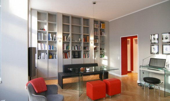Aus dieser weiß lackierten, eigentlich schlichten Regalwand ragen betont 3 Kuben heraus und bringen so Spannung ins Möbel.