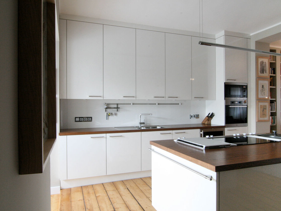 Hochglänzende Küchenfronten werden ergänzt mit Arbeitsplatten in Walnuss Furnier.