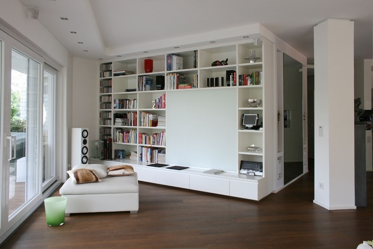 Hinter der lackierten Schiebetür befindet sich Fernseher & Co. Im geschlossenen Zustand entsteht die homogene Optik eines reinen Buchregals. Aus dem sehr flach und unauffällig gehaltenem „Sockelteil“ lassen sich Schubkästen herausziehen die noch mehr Platz für Ordnung bieten.